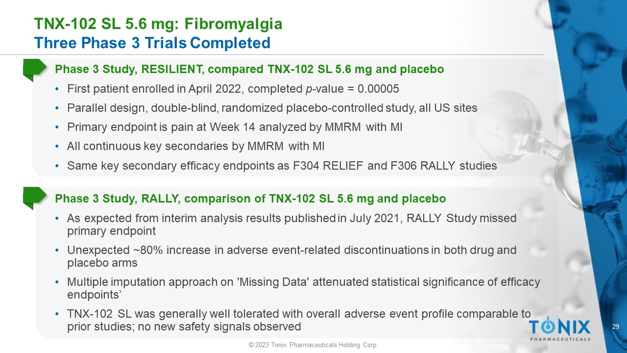 28 © 2023 Tonix Pharmaceuticals Holding Corp. TNX - 102 SL – Sublingual Administration and Transmucosal Delivery • Advantages of the sublingual route • Faster absorption provides PK that is ideal for bedtime dosing • Bypasses “first - pass” hepatic metabolism • Reduced metabolism of parent CBP to active metabolite norcyclobenzaprine (nCBP)