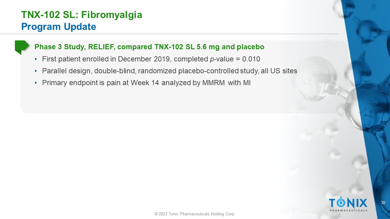 29 © 2023 Tonix Pharmaceuticals Holding Corp. TNX - 102 SL 5.6 mg: Fibromyalgia Three Phase 3 Trials Completed Phase 3 Study, RESILIENT, compared TNX - 102 SL 5.6 mg and placebo • First patient enrolled in April 2022, completed p - value = 0.00005 • Parallel design, double - blind, randomized placebo - controlled study, all US sites • Primary endpoint is pain at Week 14 analyzed by MMRM with MI • All continuous key secondaries by MMRM with MI • Same key secondary efficacy endpoints as F304 RELIEF and F306 RALLY studies Phase 3 Study, RALLY, comparison of TNX - 102 SL 5.6 mg and placebo • As expected from interim analysis results published in July 2021, RALLY Study missed primary endpoint • Unexpected ~80% increase in adverse event - related discontinuations in both drug and placebo arms • Multiple imputation approach on 'Missing Data' attenuated statistical significance of efficacy endpoints’ • TNX - 102 SL was generally well tolerated with overall adverse event profile comparable to prior studies; no new safety signals observed