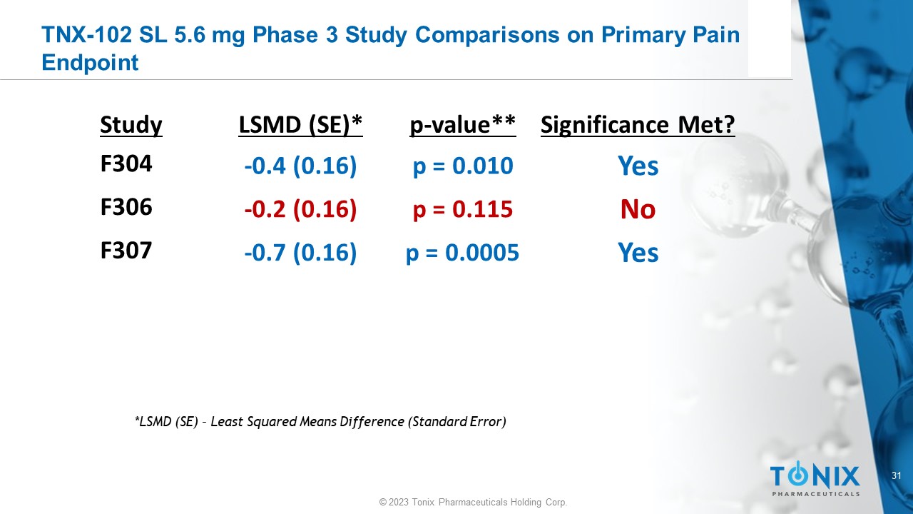30 © 2023 Tonix Pharmaceuticals Holding Corp. TNX - 102 SL: Fibromyalgia Program Update Phase 3 Study, RELIEF, compared TNX - 102 SL 5.6 mg and placebo • First patient enrolled in December 2019, completed p - value = 0.010 • Parallel design, double - blind, randomized placebo - controlled study, all US sites • Primary endpoint is pain at Week 14 analyzed by MMRM with MI