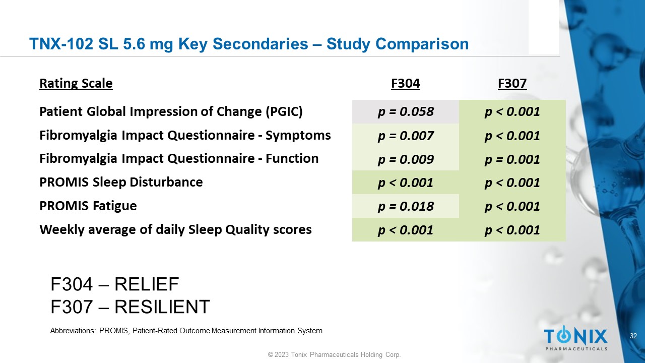 31 © 2023 Tonix Pharmaceuticals Holding Corp. TNX - 102 SL 5.6 mg Phase 3 Study Comparisons on Primary Pain Endpoint Significance Met? p - value** LSMD (SE)* Study Yes p = 0.010 - 0.4 (0.16) F304 No p = 0.115 - 0.2 (0.16) F306 Yes p = 0.0005 - 0.7 (0.16) F307 *LSMD (SE) – Least Squared Means Difference (Standard Error)