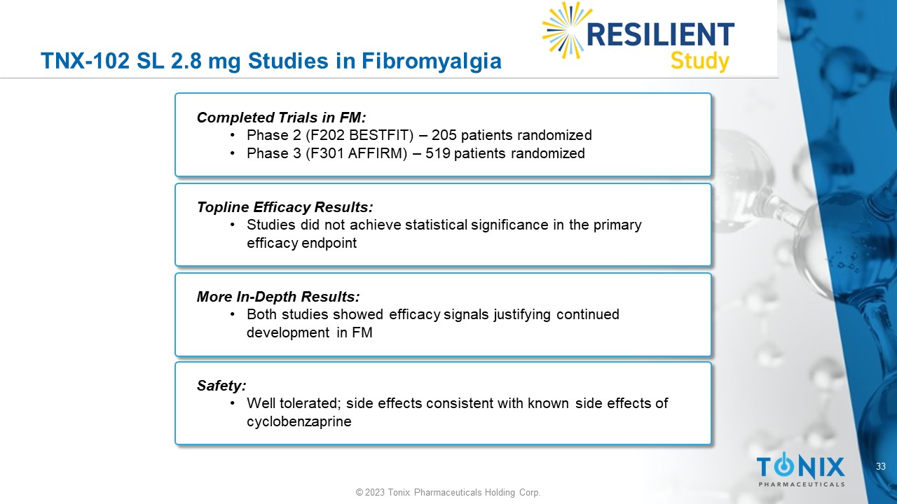 32 © 2023 Tonix Pharmaceuticals Holding Corp. TNX - 102 SL 5.6 mg Key Secondaries – Study Comparison F307 F304 Rating Scale p < 0.001 p = 0.058 Patient Global Impression of Change (PGIC) p < 0.001 p = 0.007 Fibromyalgia Impact Questionnaire - Symptoms p = 0.001 p = 0.009 Fibromyalgia Impact Questionnaire - Function p < 0.001 p < 0.001 PROMIS Sleep Disturbance p < 0.001 p = 0.018 PROMIS Fatigue p < 0.001 p < 0.001 Weekly average of daily Sleep Quality scores F304 – RELIEF F307 – RESILIENT Abbreviations: PROMIS, Patient - Rated Outcome Measurement Information System
