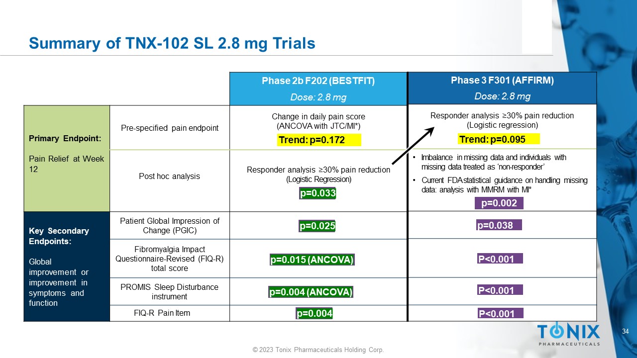 33 © 2023 Tonix Pharmaceuticals Holding Corp. TNX - 102 SL 2.8 mg Studies in Fibromyalgia Completed Trials in FM: • Phase 2 (F202 BESTFIT) – 205 patients randomized • Phase 3 (F301 AFFIRM) – 519 patients randomized Topline Efficacy Results: • Studies did not achieve statistical significance in the primary efficacy endpoint More In - Depth Results: • Both studies showed efficacy signals justifying continued development in FM Safety: • Well tolerated; side effects consistent with known side effects of cyclobenzaprine