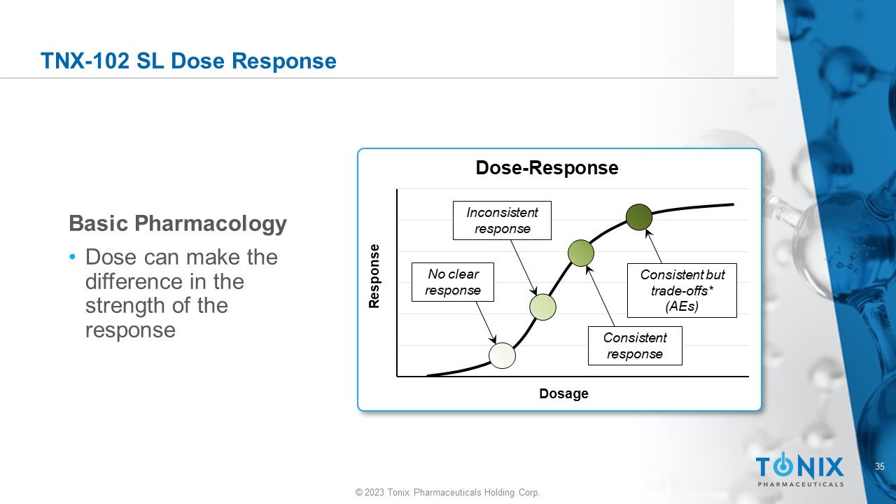 35 © 2023 Tonix Pharmaceuticals Holding Corp. TNX - 102 SL Dose Response Response Dosage Dose - Response Inconsistent response No clear response Consistent response Consistent but trade - offs* (AEs) Basic Pharmacology • Dose can make the difference in the strength of the response
