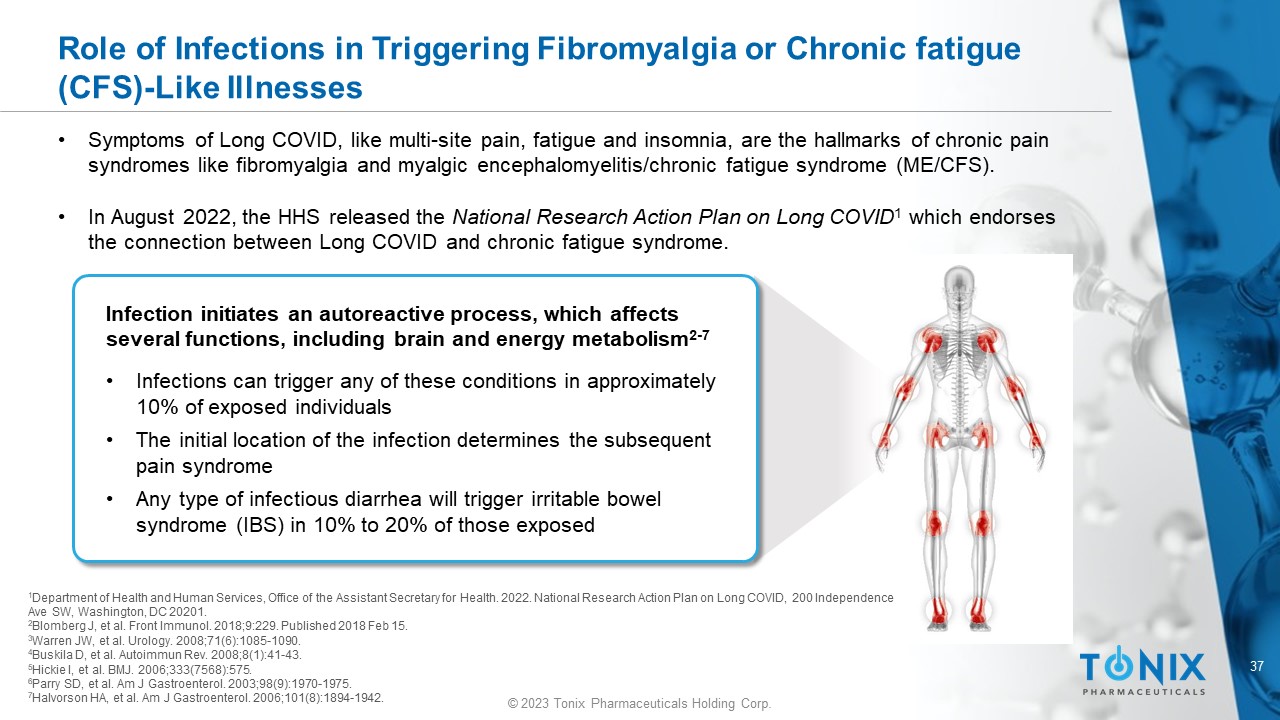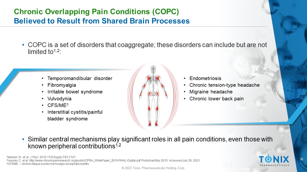 36 © 2023 Tonix Pharmaceuticals Holding Corp. Chronic Overlapping Pain Conditions (COPC) Believed to Result from Shared Brain Processes • COPC is a set of disorders that coaggregate ; these disorders can include but are not limited to 1,2 : • Temporomandibular disorder • Fibromyalgia • Irritable bowel syndrome • Vulvodynia • CFS/ME 3 • Interstitial cystitis/painful bladder syndrome • Endometriosis • Chronic tension - type headache • Migraine headache • Chronic lower back pain 1 Maixner W, et al. J Pain . 2016;17(9 Suppl):T93 - T107. 2 Veasley C, et al. http://www.chronicpainresearch. org/public/CPRA_WhitePaper_2015 - FINAL - Digital.pdf. Published May 2015. Accesse d July 26, 2021. 3 CFS/ME – chronic fatigue syndrome/ myalgic encephalomyelitis • Similar central mechanisms play significant roles in all pain conditions, even those with known peripheral contributions 1,2