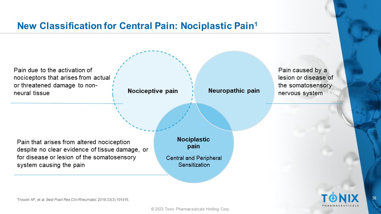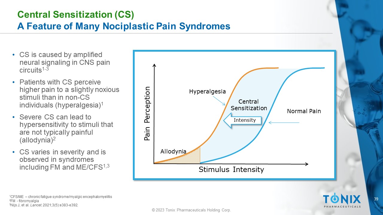 38 © 2023 Tonix Pharmaceuticals Holding Corp. New Classification for Central Pain: Nociplastic Pain 1 Nociplastic pain Nociceptive pain Neuropathic pain Pain due to the activation of nociceptors that arises from actual or threatened damage to non - neural tissue Pain that arises from altered nociception despite no clear evidence of tissue damage, or for disease or lesion of the somatosensory system causing the pain Pain caused by a lesion or disease of the somatosensory nervous system 1 Trouvin AP, et al. Best Pract Res Clin Rheumatol . 2019;33(3):101415. Central and Peripheral Sensitization