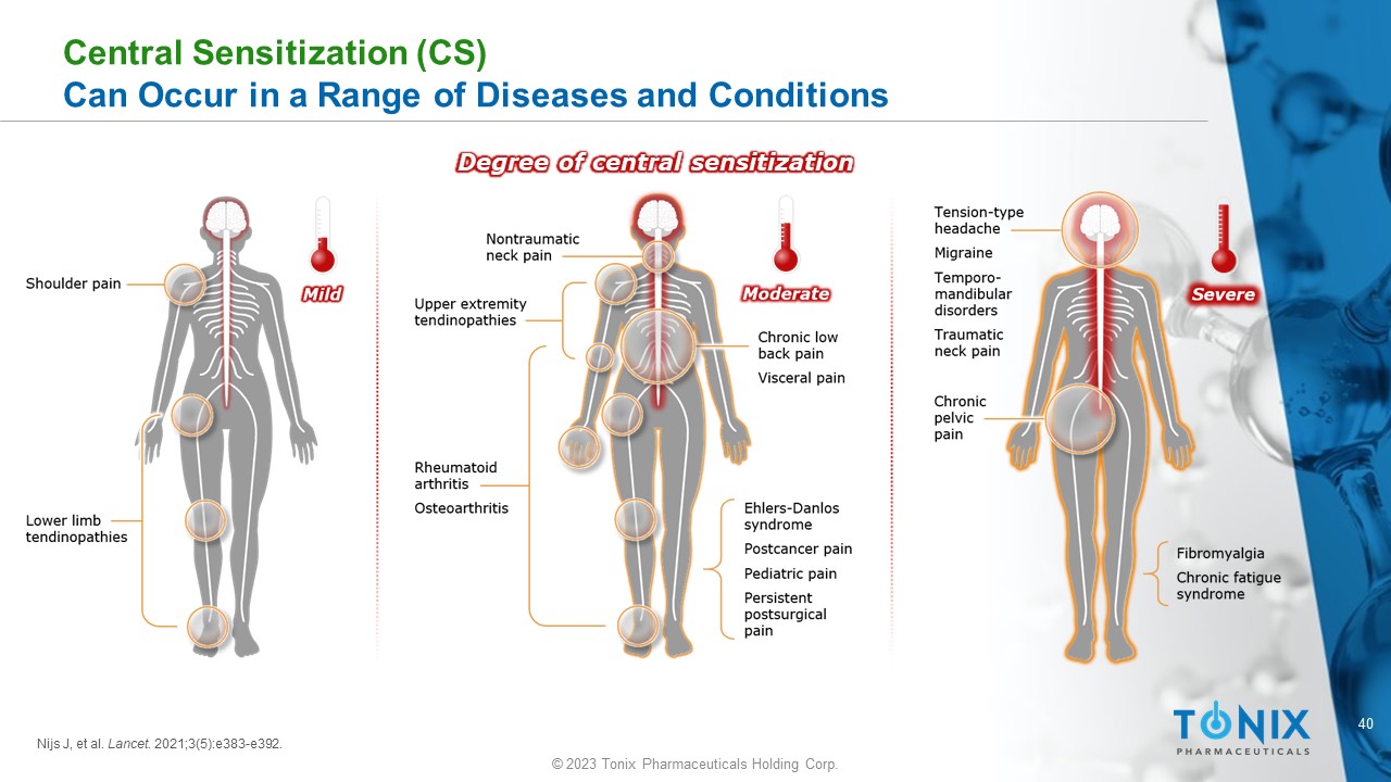 39 © 2023 Tonix Pharmaceuticals Holding Corp. Central Sensitization (CS) A Feature of Many Nociplastic Pain Syndromes • CS is caused by amplified neural signaling in CNS pain circuits 1 - 3 • Patients with CS perceive higher pain to a slightly noxious stimuli than in non - CS individuals (hyperalgesia) 1 • Severe CS can lead to hypersensitivity to stimuli that are not typically painful (allodynia) 2 • CS varies in severity and is observed in syndromes including FM and ME/CFS 1,3 Stimulus Intensity Pain Perception Normal Pain Hyperalgesia Allodynia Central Sensitization Intensity 1 CFS/ME – chronic fatigue syndrome/ myalgic encephalomyelitis 2 FM - fibromyalgia 3 Nijs J, et al. Lancet . 2021;3(5):e383 - e392.