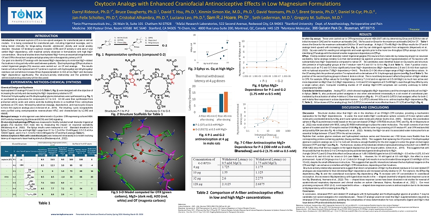 Oxytocin Analogs with Enhanced Craniofacial Antinociceptive Effects in Low Magnesium Formulations Darryl Rideout, Ph.D. 1* , Bruce Daugherty, Ph.D. 1 , David T. Hsu, Ph.D. 1 , Xinmin Simon Xie, M.D., Ph.D. 2 , David Yeomans, Ph.D. 3 , Brent Stranix, Ph.D. 4 , Daniel St - Cyr, Ph.D. 4 , Jan - Felix Scholtes, Ph.D. 4 , Cristobal Alhambra, Ph.D. 4 , Luciana Leo, Ph.D. 5 , Sam R.J. Hoare, Ph.D 5 ., Seth Lederman, M.D. 1 , Gregory M. Sullivan, M.D. 1 1 Tonix Pharmaceuticals Inc., 26 Main St, Suite 101 Chatham NJ 07928 2 AfaSci Research Laboratories, 522 Second Avenue, Redwood City, CA 94063 3 Stanford University Dept. of Anesthesiology, Perioperative and Pain Medicine 300 Pasteur Drive, Room H3580 MC 5640 Stanford, CA 94305 4 X - Chem, Inc. 4800 Rue Levy - Suite 200, Montreal, QC, Canada H4S 1Z9 5 Montana Molecular, 366 Gallatin Park Dr., Bozeman, MT 59715 Presented at the American Chemical Society Spring 2024 Meeting March 20. 2024 www.tonixpharma.com a Presenter RESULTS Fig. 2b Meyerowitz Mg hydrate binding to OT OTR DISCUSSION AND CONCLUSIONS INTRODUCTION Fig. 4 P - 1 and G - 2 antinociception at 4 m g in male rats Fig.5 3 - D Model computed for OTR (green carbons), Mg2+ (dark red), H2O (red, white) and OT (magenta carbons) Fig. 7 C - fiber Antinociceptive Mg2+ Dependence for P - 1 (300 mM vs 0 mM, Bharadwaj ) and G - 2 (1.75 mM vs 0.5 mM) Fig. 3 Ephys vs. Gq at high Mg2+ Introduction Intranasal oxytocin (OT) is a non - opioid analgesic for craniofacial pain in animal models . It is being considered for craniofacial pain, including trigeminal neuralgia, and is being tested clinically for binge - eating disorder, adolescent obesity and social anxiety disorder . However, OT binding to oxytocin receptor (OTR) and OT activity in vitro and in vivo exhibit Mg 2 + dependency, with maximal activity observed in formulations with high Mg 2 + concentration . Structural studies show that hydrated Mg 2 + forms an essential bridge between OT and OTR in the active complex and plays a key role in the agonistic potency of OT . Our goal is to identify OT analogs with decreased Mg 2 + dependency to minimize Mg 2 + - related fluctuations in drug activity within and between patients . E lectrophysiology ( EPhys ) studies in rodent trigeminal ganglia (TG) neurons were carried out on OT and analogs . The results herein will show that replacement of 7 - proline in oxytocin with hydroxyalkyl and dihydroxyalkyl residues can sometimes increase Emax (hyperpolarization in mV) at low Mg 2 + and decrease Mg 2 + dependence significantly . The structure - activity relationship and the potential for antinociceptive drug discovery will be discussed . EXPERIMENTAL METHODS - CHEMICAL SYNTHESIS Chemical Design and Synthesis Hydroxylated OT analogs P - 2 and G - 1 to G - 5 ( Table 1 , Fig . 2 ) were designed with the objective of increasing the activity and decreasing the Mg 2 + dependency relative to OT . Protected N - hydroxyalkyl and N - dihydroxyalkyl glycine derivatives were synthesized ( e . g . Fig . 1 ) or purchased as precursors for compounds G - 1 to G - 5 . G 1 - G 5 were then synthesized from protected amino acids and amino acid - like building blocks in a modified Fmoc solid - phase synthesis on CTC resin, followed by selective cleavage, deprotection, and macrocycle closure to form the oxytocin analogs (as in Ichinose et al . , 2019 ) . The resulting cyclic nonapeptides were purified using semipreparative reverse - phase HPLC and characterized by LC/MS and HNMR . Biological assays In vitro agonism was determined in G - protein OTR - expressing cultured HEK - 293 T cells by measuring Gq (Emax and EC 50 ) and DAG signaling . Ex vivo electrophysiology ( EPhys ) was measured in freshly isolated small diameter trigeminal ganglia (TG) neurons from male rats by measuring the impact on neuronal excitability ( Bhadarwaj et al . , 2022 ) . The Ephys results were measured in mV . Standard deviations for Ephys E values at low and high Mg 2 + range from 0 . 1 to 1 . 2 mV for 10 nM ligand, 0 . 3 - 1 . 8 mV for 100 nM ligand , and 0 . 1 to 1 . 1 mV for 100 - 0 nM ligand for OT and the 6 analogs ( Table 1 ) . Antinociception in Rats with craniofacial pain was measured intranasally in a model involving latency of response to laser heating stimulus ( Bhadarwaj et al . , 2022 ) . In vitro Gq assays . These were carried out in OTR - expressing cultured HEK - 293 T cells by determining Emax and EC 50 for rate of initial increase in DAG and for maximum achievable DAG . We focused on Emax for the maximum achievable DAG for OT . Table 1 shows the Emax for the maximum achievable DAG for OT and 4 analogs . At high ( 1 . 75 mM) Mg 2 + the EPhys results for OT and 4 analogs trend upward with increasing Gq active ( Fig . 3 ), and Gq can distinguish agonists from antagonists (Meyerowitz et al . , 2022 ) . Gq was useful for weeding out antagonists and weak agonists prior to the more low - throughput EPhys assays, but not for identifying OT analogs with the desired smaller magnesium dependence in EPhys . EPhys . Freshly isolated small diameter rodent trigeminal ganglia (TG) neurons from male rats by measuring impact on neuronal excitability . Some analogs (notably G - 2 ) that demonstrated Gq agonism produced robust hyperpolarization of TG neurons with substantially less Mg 2 + dependence compared to native OT . Six candidates were identified based on Gq results and structure (the presence of hydroxyalkyl groups at the 7 - residue — see P - 2 and G - 1 to G - 5 in Fig . 2 and Table 1 ) . Even 7 - position mono - alcohols such as P - 2 and G - 5 show significantly lower Mg 2 + dependencies (Mg 2 + dependencies 2 . 8 and 3 . 8 mV) than oxytocin with no hydroxyl at position 7 (Mg 2 + dependency = 9 mV) . The diols (G - 1 - G 4 ) show a larger range of Mg 2 + dependency values . In the OT analog diols the proline at position 7 is replaced with a derivatives of N - 3 - hydroxypropyl glycine (see Fig . 2 and Table 1 ) . The position of the second hyd