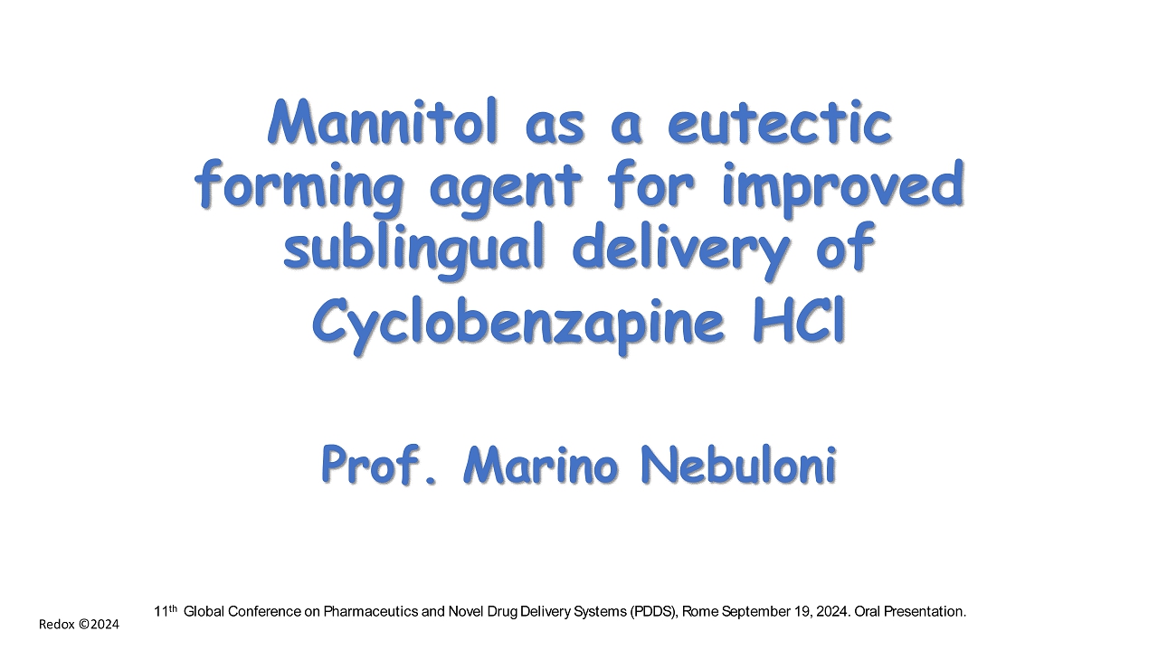 Redox ©2024 Mannitol as a eutectic forming agent for improved sublingual delivery of Cyclobenzapine HCl Prof. Marino Nebuloni 11 th Global Conference on Pharmaceutics and Novel Drug Delivery Systems (PDDS), Rome September 19, 2024. Oral Presentation.