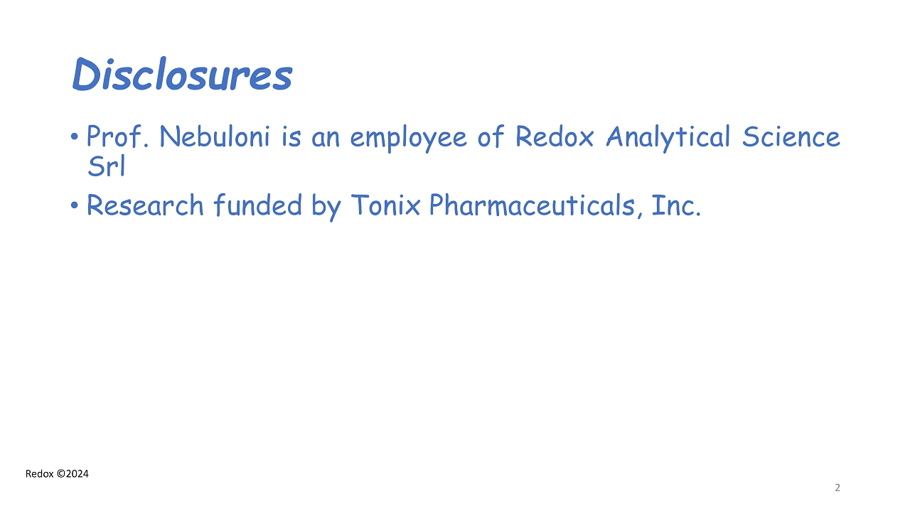 Redox ©2024 Disclosures • Prof . Nebuloni is an employee of Redox Analytical Science Srl • Research funded by Tonix Pharmaceuticals, Inc . 2