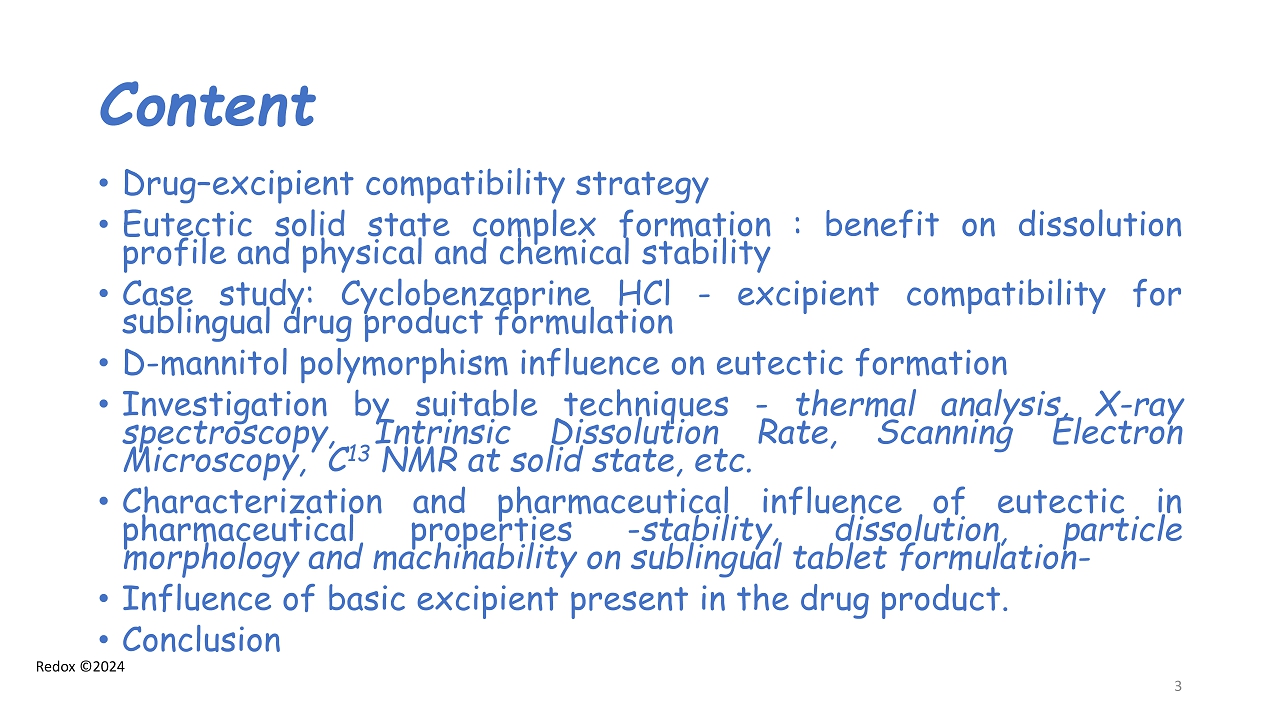 Redox ©2024 Content • Drug – excipient compatibility strategy • Eutectic solid state complex formation : benefit on dissolution profile and physical and chemical stability • Case study : Cyclobenzaprine HCl - excipient compatibility for sublingual drug product formulation • D - mannitol polymorphism influence on eutectic formation • Investigation by suitable techniques - thermal analysis, X - ray spectroscopy, Intrinsic Dissolution Rate, Scanning Electron Microscopy, C 13 NMR at solid state, etc . • Characterization and pharmaceutical influence of eutectic in pharmaceutical properties - stability, dissolution, particle morphology and machinability on sublingual tablet formulation - • Influence of basic excipient present in the drug product . • Conclusion 3