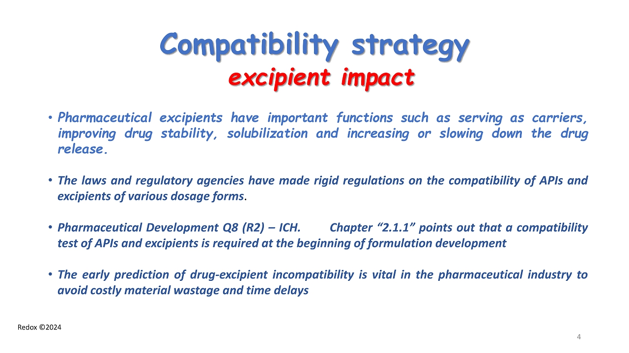 Redox ©2024 Compatibility strategy excipient impact 4 • Pharmaceutical excipients have important functions such as serving as carriers, improving drug stability, solubilization and increasing or slowing down the drug release . • The laws and regulatory agencies have made rigid regulations on the compatibility of APIs and excipients of various dosage forms . • Pharmaceutical Development Q 8 (R 2 ) – ICH . Chapter “ 2 . 1 . 1 ” points out that a compatibility test of APIs and excipients is required at the beginning of formulation development • The early prediction of drug - excipient incompatibility is vital in the pharmaceutical industry to avoid costly material wastage and time delays