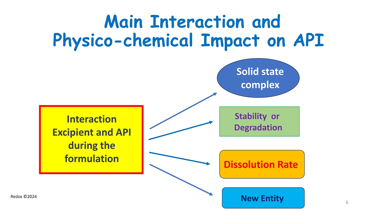 Redox ©2024 Main Interaction and Physico - chemical Impact on API Solid state complex Dissolution Rate Stability or Degradation New Entity Interaction Excipient and API during the formulation 6