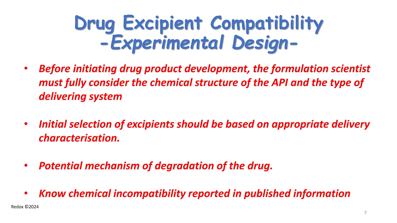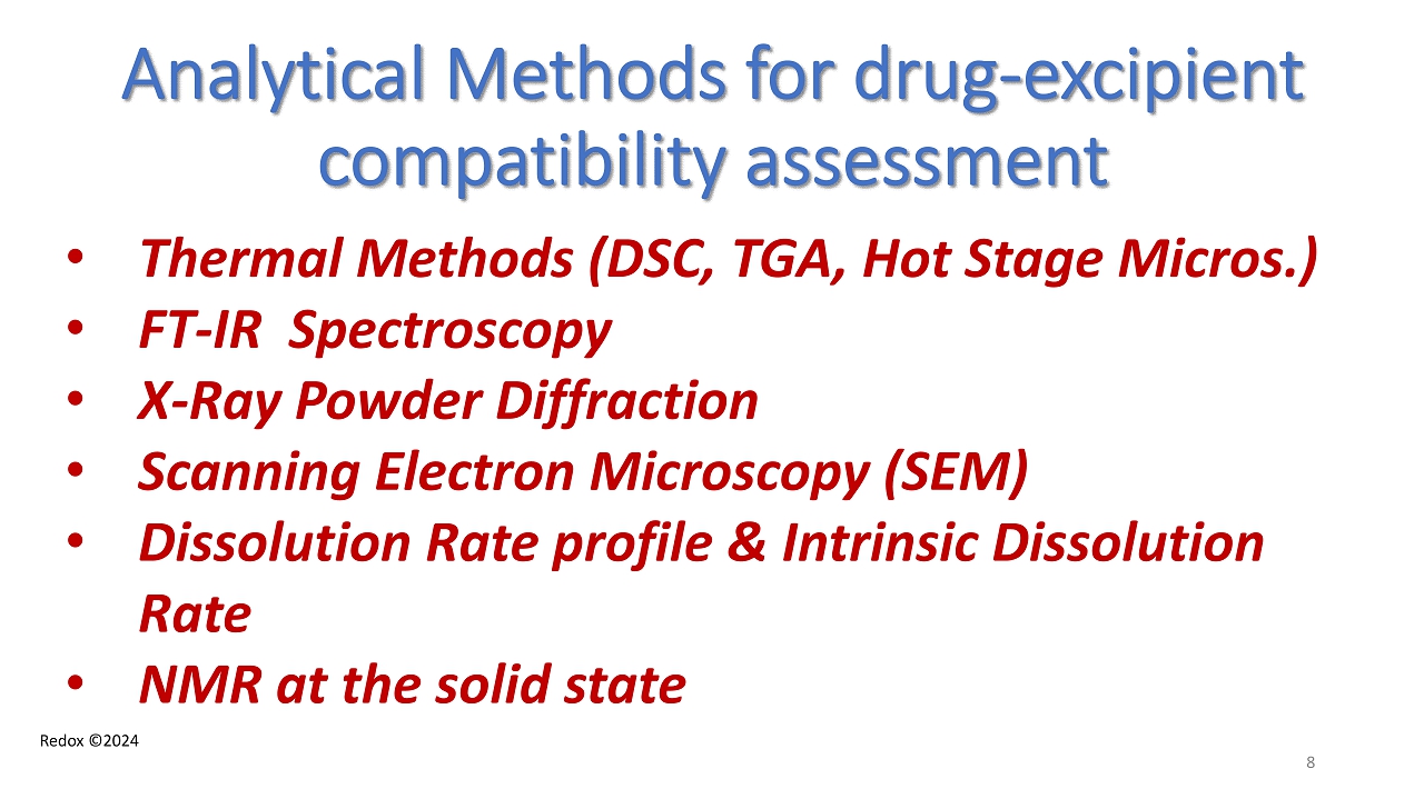 Redox ©2024 Drug Excipient Compatibility - Experimental Design - • Before initiating drug product development , the formulation scientist must fully consider the chemical structure of the API and the type of delivering system • Initial selection of excipients should be based on appropriate delivery characterisation . • Potential mechanism of degradation of the drug . • Know chemical incompatibility reported in published information 7