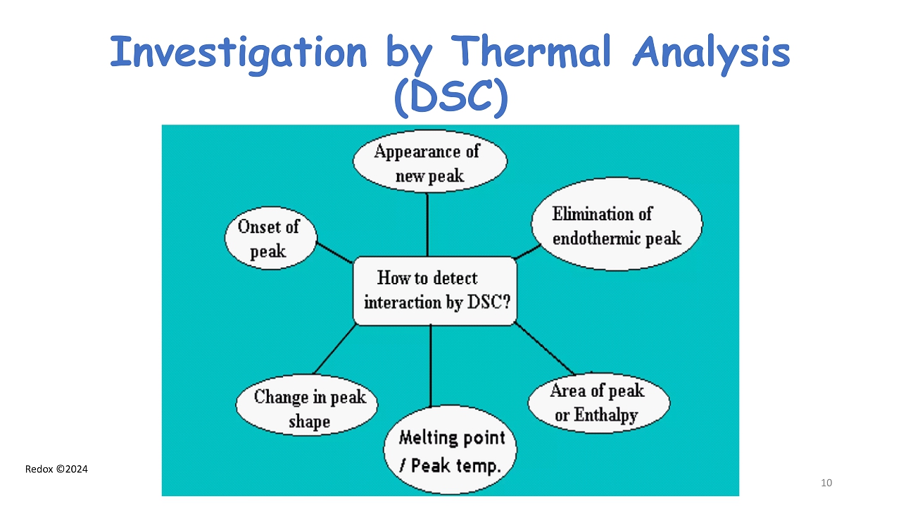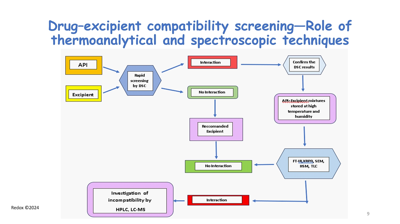 Redox ©2024 Analytical Methods for drug - excipient compatibility assessment • Thermal Methods (DSC, TGA, Hot Stage Micros .) • FT - IR Spectroscopy • X - Ray Powder Diffraction • Scanning Electron Microscopy (SEM) • Dissolution Rate profile & Intrinsic Dissolution Rate • NMR at the solid state 8