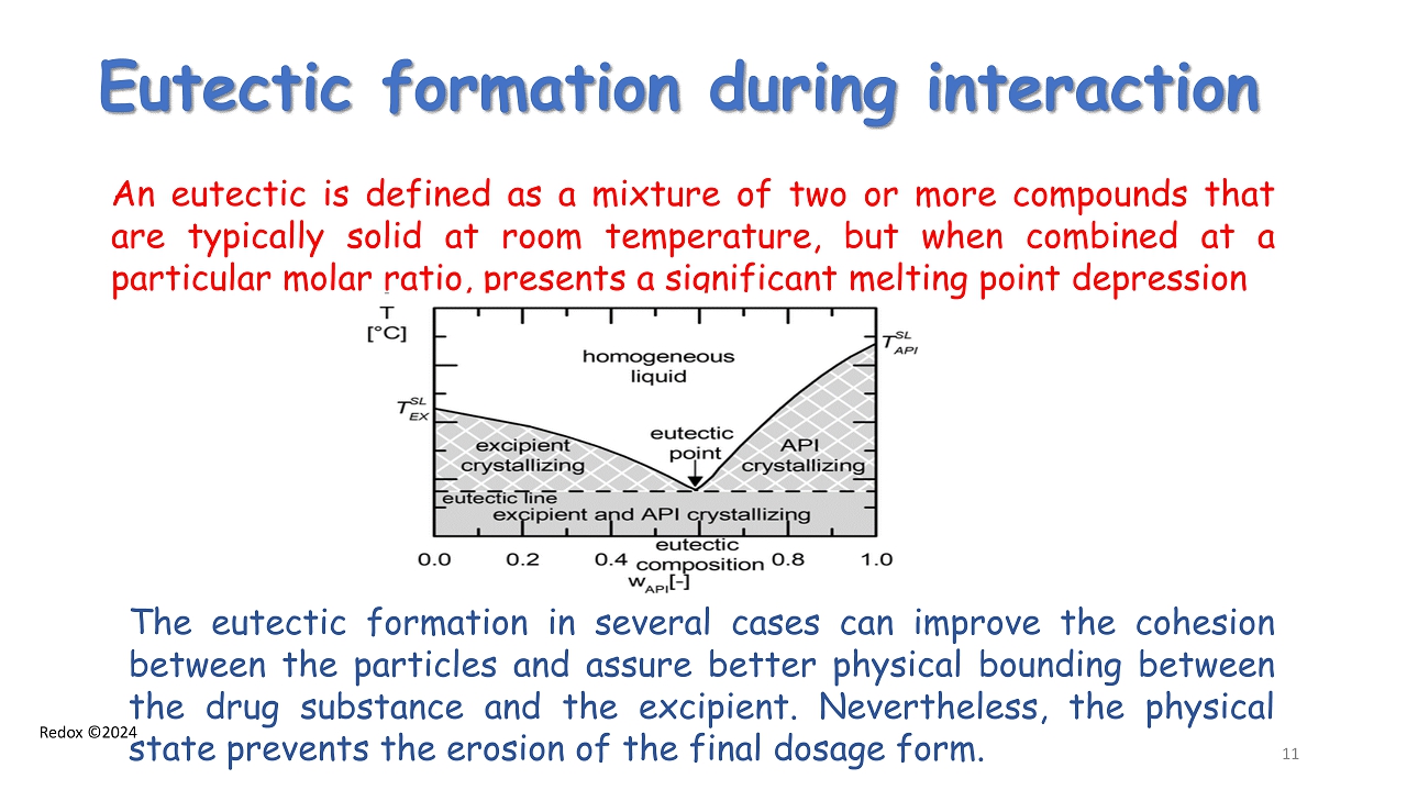 Redox ©2024 Eutectic formation during interaction The eutectic formation in several cases can improve the cohesion between the particles and assure better physical bounding between the drug substance and the excipient . Nevertheless, the physical state prevents the erosion of the final dosage form . An eutectic is defined as a mixture of two or more compounds that are typically solid at room temperature, but when combined at a particular molar ratio, presents a significant melting point depression 11