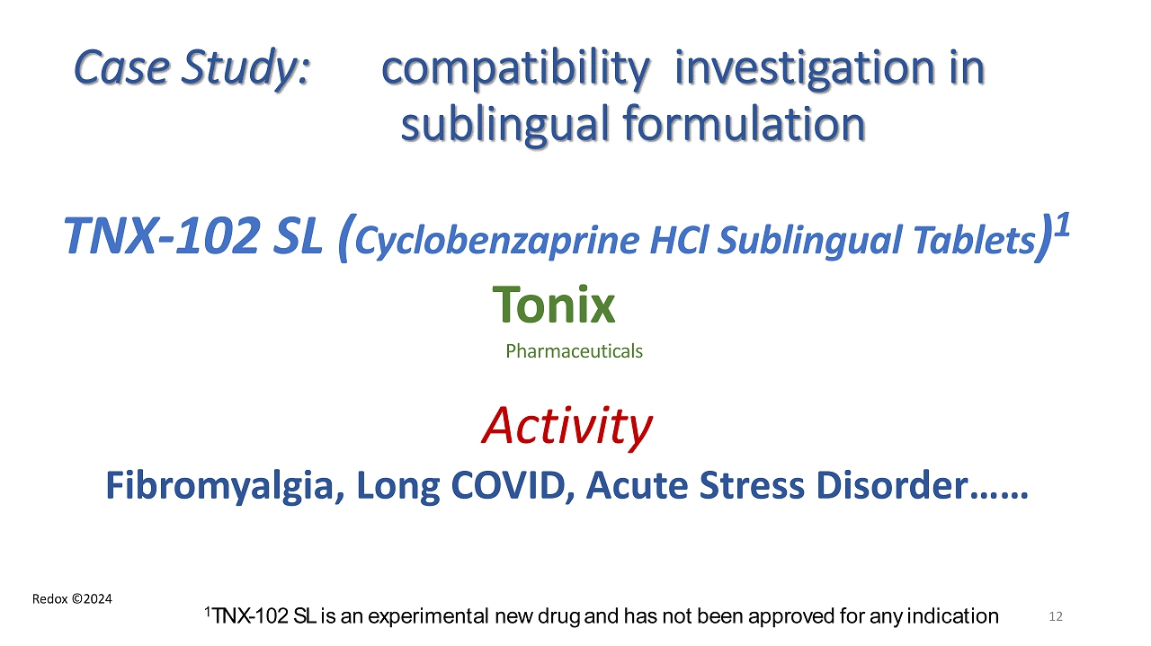 Redox ©2024 Case Study: compatibility investigation in sublingual formulation TNX - 102 SL ( Cyclobenzaprine HCl Sublingual Tablets ) 1 Tonix Pharmaceuticals Activity Fibromyalgia, Long COVID, Acute Stress Disorder…… 12 1 TNX - 102 SL is an experimental new drug and has not been approved for any indication