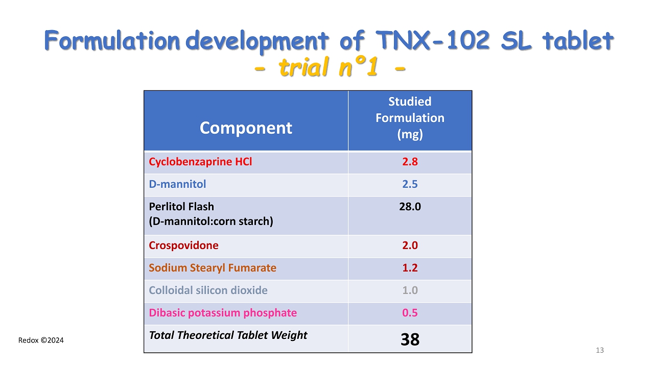 Redox ©2024 Formulation development of TNX - 102 SL tablet - trial n ° 1 - Component Studied Formulation (mg) Cyclobenzaprine HCl 2.8 D - mannitol 2.5 Perlitol Flash ( D - mannitol:corn starch ) 28.0 Crospovidone 2.0 Sodium Stearyl Fumarate 1.2 Colloidal silicon dioxide 1.0 Dibasic potassium phosphate 0.5 Total Theoretical Tablet Weight 38 13