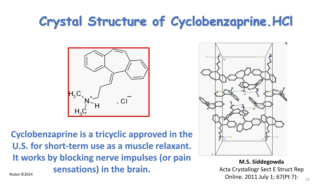 Redox ©2024 Crystal Structure of Cyclobenzaprine.HCl M.S. Siddegowda Acta Crystallogr Sect E Struct Rep Online. 2011 July 1; 67( Pt 7): 14 Cyclobenzaprine is a tricyclic approved in the U.S. for short - term use as a muscle relaxant. It works by blocking nerve impulses (or pain sensations) in the brain.