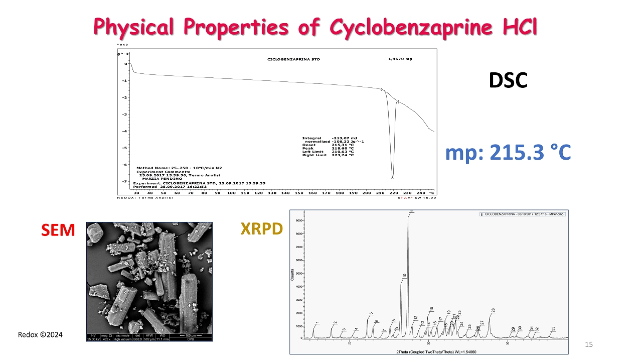 Redox ©2024 Physical Properties of Cyclobenzaprine HCl Integral -213,07 mJ normalized -108,32 Jg^-1 Onset 215,31 °C Peak 218,60 °C Left Limit 210,63 °C Right Limit 223,74 °C 1,9670 mg CICLOBENZAPRINA STD Experiment Comments: 25.09.2017 15:59:56, Termo Analisi MARZIA PENDINO Method Name: 25..250 - 10°C/min N2 Experiment: CICLOBENZAPRINA STD, 25.09.2017 15:59:35 Performed 25.09.2017 16:22:53 Wg^-1 -7 -6 -5 -4 -3 -2 -1 0 °C30 40 50 60 70 80 90 100 110 120 130 140 150 160 170 180 190 200 210 220 230 240 ^exo STARe SW 15.00 REDOX: Termo Analisi DSC mp: 215.3 ° C XRPD SEM 15