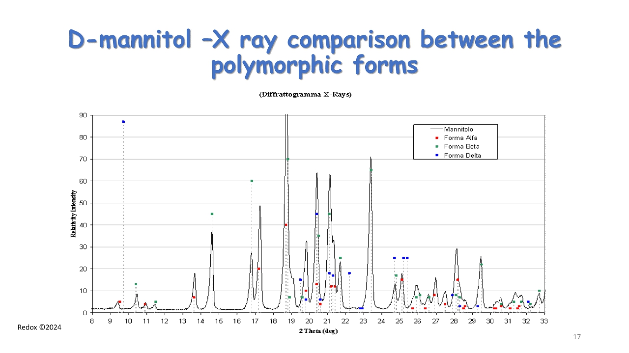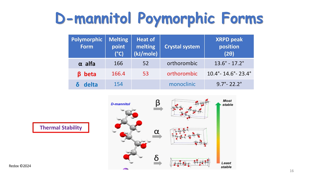 Redox ©2024 D - mannitol Poymorphic Forms Polymorphic Form Melting point ( ° C) Heat of melting (kJ/mole) Crystal system XRPD peak position (2 θ ) α alfa 166 52 orthorombic 13.6 ° - 17.2 ° β beta 166.4 53 orthorombic 10.4 ° - 14.6 ° - 23.4 ° δ delta 154 monoclinic 9.7 ° - 22.2 ° Thermal Stability 16