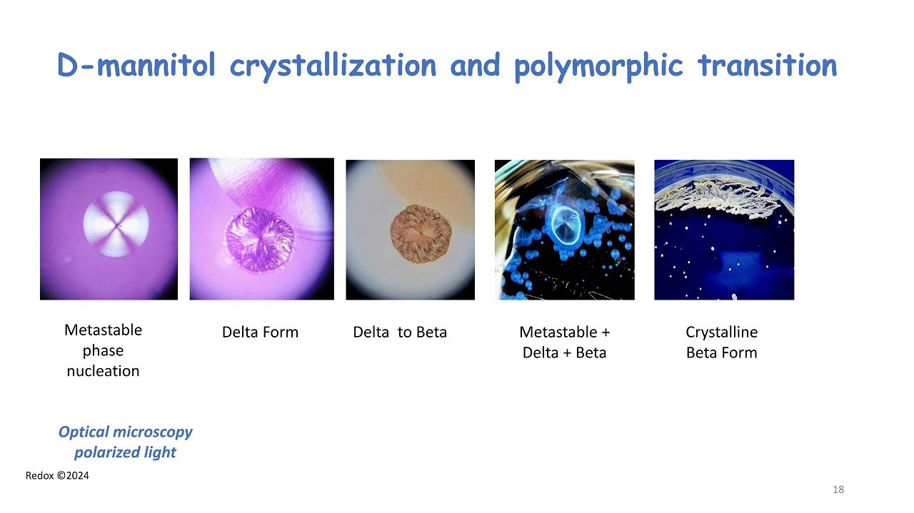 Redox ©2024 D - mannitol crystallization and polymorphic transition Optical microscopy polarized light Metastable phase nucleation Delta Form Delta to Beta Metastable + Delta + Beta Crystalline Beta Form 18