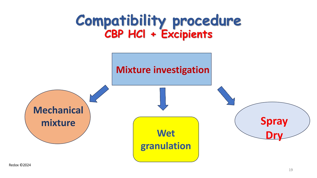 Redox ©2024 Compatibility procedure CBP HCl + Excipients Mechanical mixture Wet granulation Spray Dry Mixture investigation 19