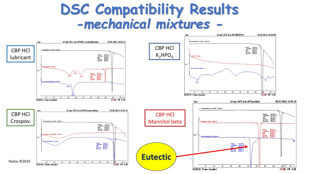 Redox ©2024 DSC Compatibility Results - mechanical mixtures - CBP HCl lubricant CBP HCl Crospov . CBP HCl K 2 HPO 4 CBP HCl Mannitol beta Eutectic 20