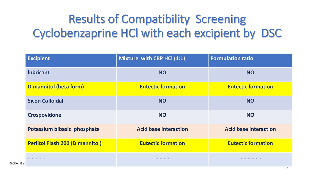 Redox ©2024 Results of Compatibility Screening Cyclobenzaprine HCl with each excipient by DSC Excipient Mixture with CBP HCl (1:1) Formulation ratio lubricant NO NO D mannitol (beta form ) Eutectic formation Eutectic formation Sicon Colloidal NO NO Crospovidone NO NO Potassium bibasic phosphate Acid base interaction Acid base interaction Perlitol Flash 200 (D mannitol ) Eutectic formation Eutectic formation …………. ………… ……………. 21