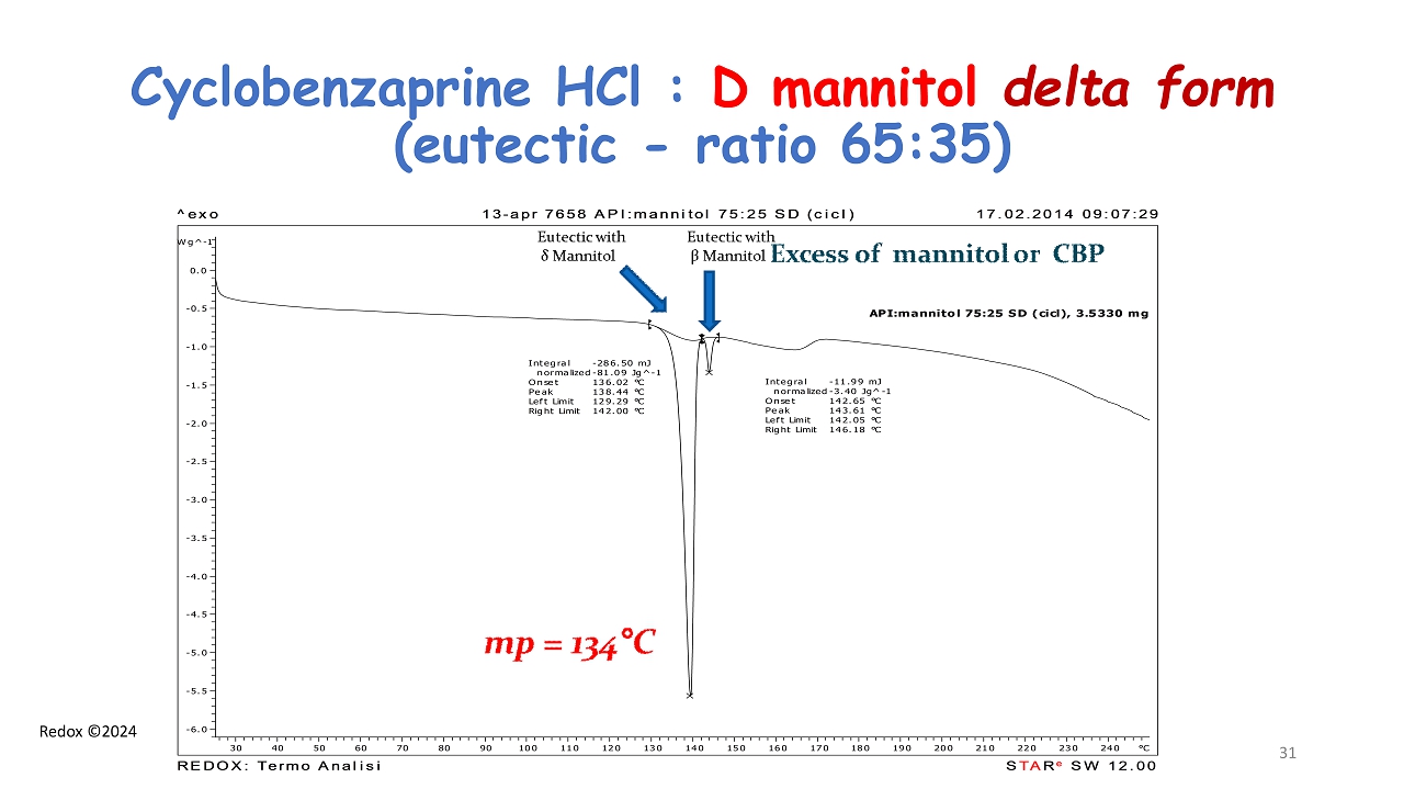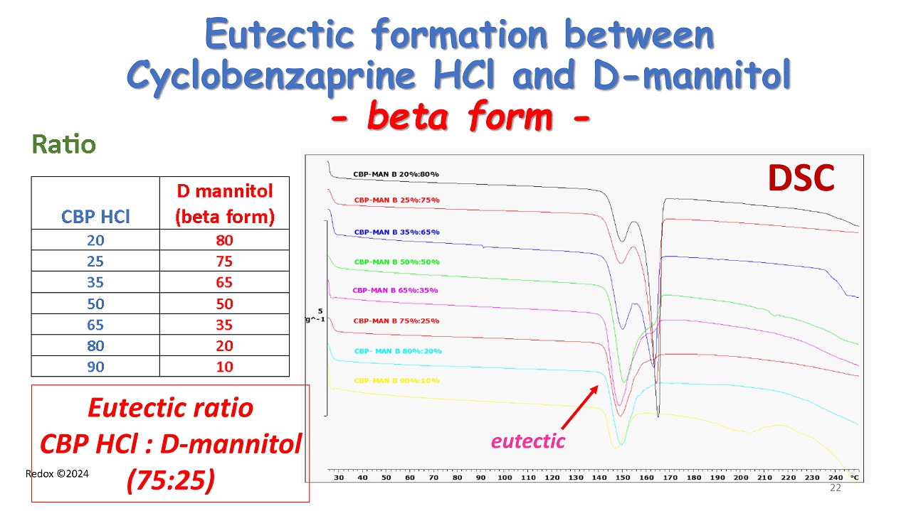 Redox ©2024 Eutectic formation between Cyclobenzaprine HCl and D - mannitol - beta form - DSC Eutectic ratio CBP HCl : D - mannitol (75:25) 22 eutectic