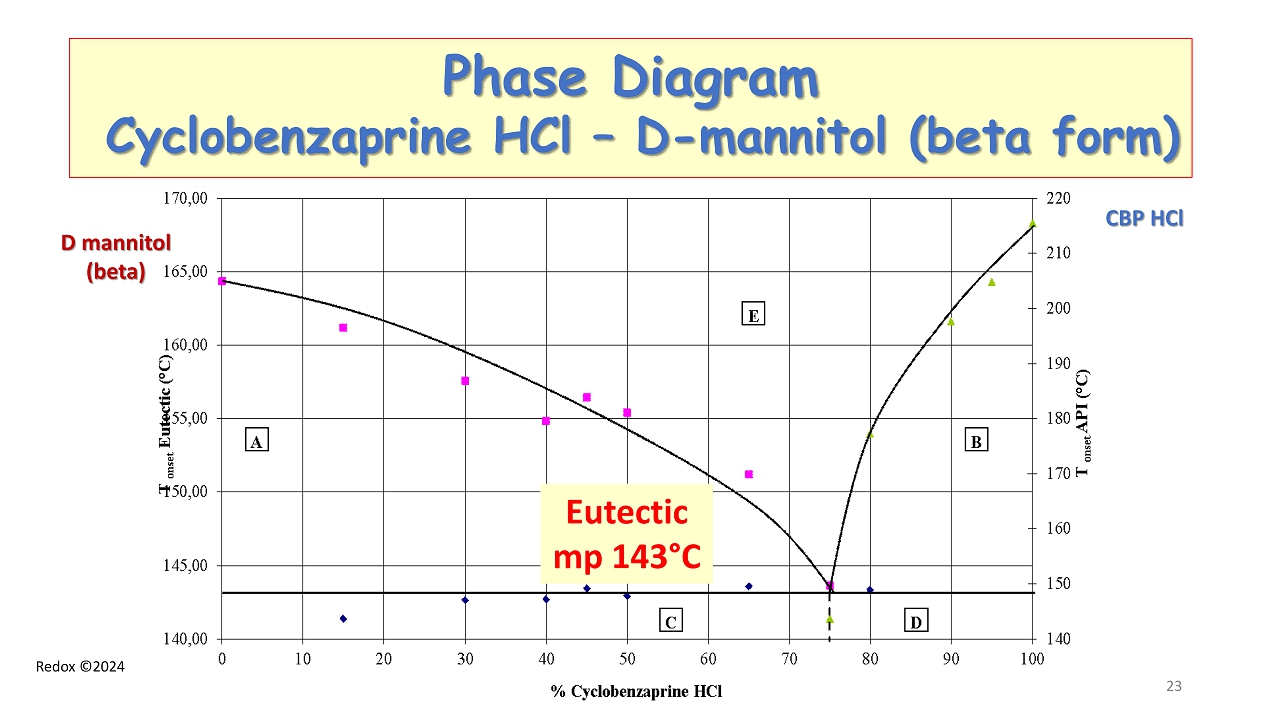 Redox ©2024 Phase Diagram Cyclobenzaprine HCl – D - mannitol (beta form ) CBP HCl D mannitol (beta) Eutectic mp 143 ° C 23