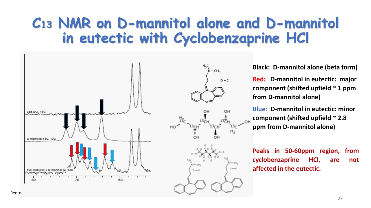 Redox ©2024 C 13 NMR on D - mannitol alone and D - mannitol in eutectic with Cyclobenzaprine HCl Black: D - mannitol alone (beta form) Red: D - mannitol in eutectic: major component (shifted upfield ~ 1 ppm from D - mannitol alone) Blue: D - mannitol in eutectic: minor component (shifted upfield ~ 2.8 ppm from D - mannitol alone) Peaks in 50 - 60 ppm region, from cyclobenzaprine HCl, are not affected in the eutectic . 29