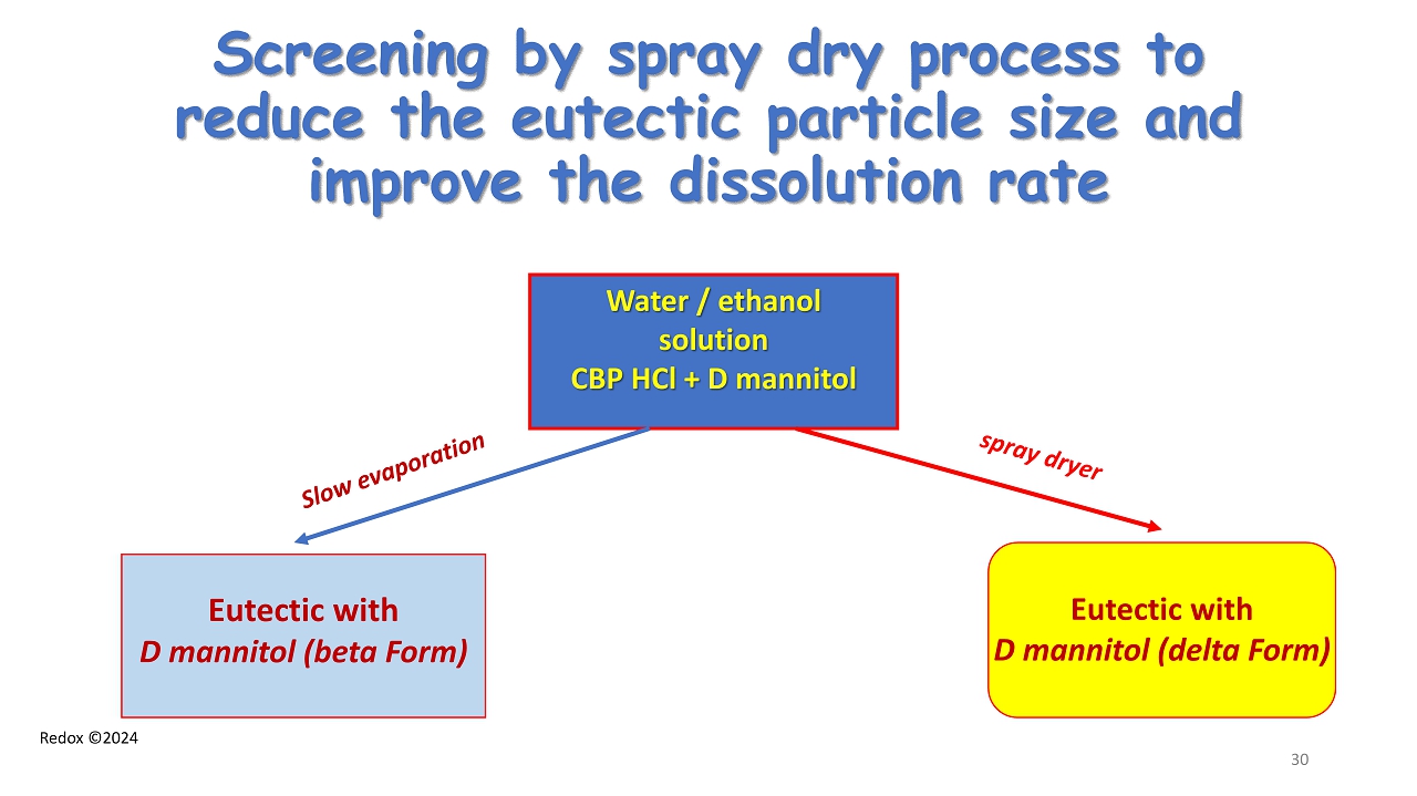 Redox ©2024 Screening by spray dry process to reduce the eutectic particle size and improve the dissolution rate Water / ethanol solution CBP HCl + D mannitol Eutectic with D mannitol (beta Form) Eutectic with D mannitol (delta Form) 30