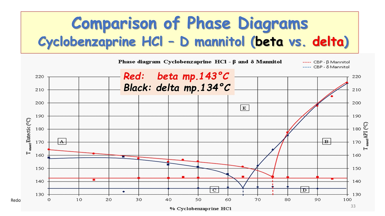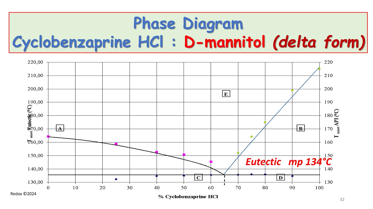 Redox ©2024 Phase Diagram Cyclobenzaprine HCl : D - mannitol (delta form ) Eutectic mp 134 ° C 32