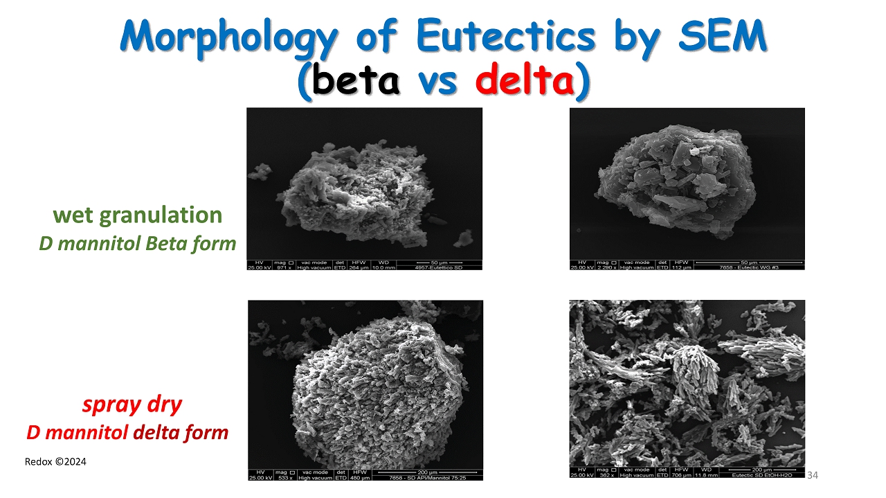 Redox ©2024 Morphology of Eutectics by SEM ( beta vs delta ) wet granulation D mannitol Beta form spray dry D mannitol delta form 34
