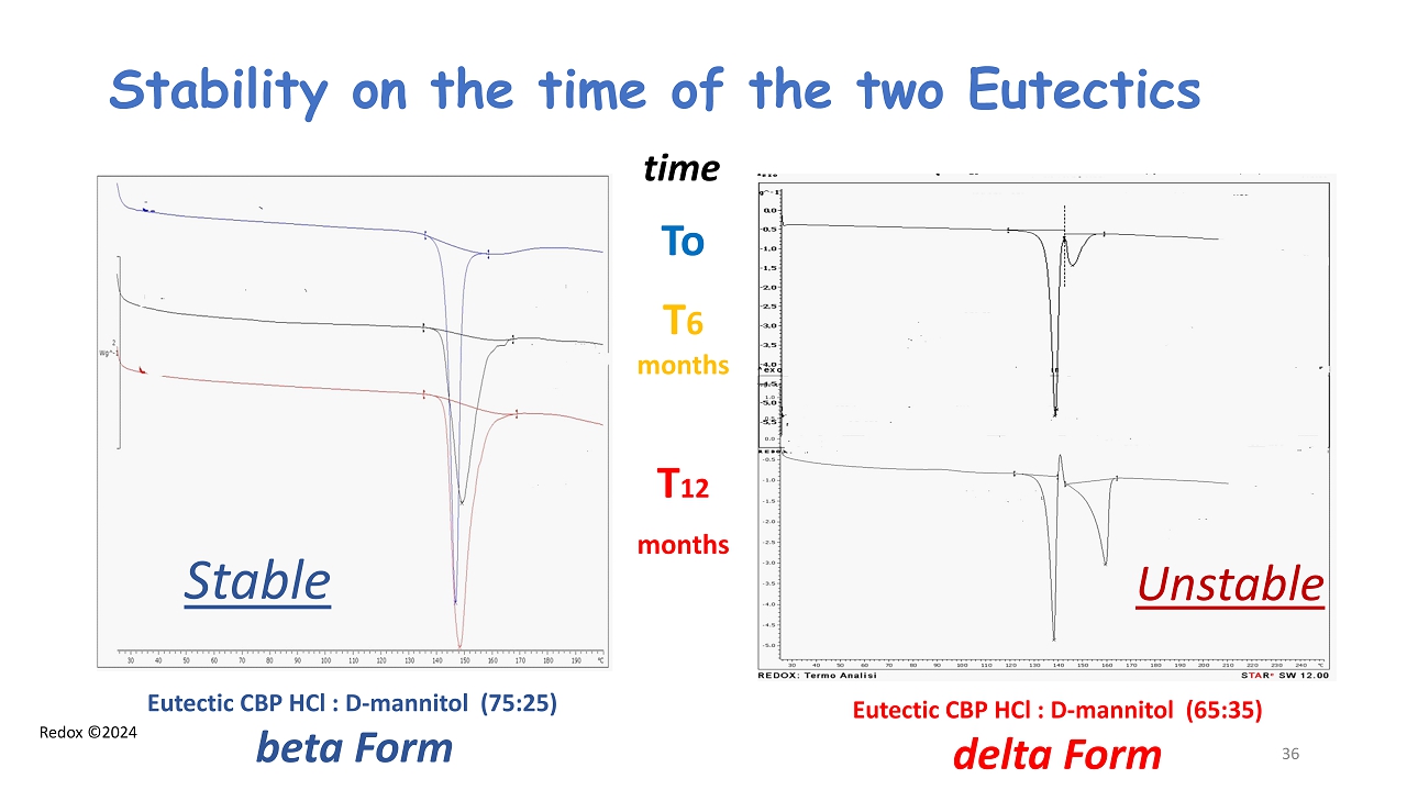 Redox ©2024 Stability on the time of the two Eutectics Eutectic CBP HCl : D - mannitol (75:25) beta Form To T 6 months T 12 months Eutectic CBP HCl : D - mannitol (65:35) delta Form time Stable Unstable 36