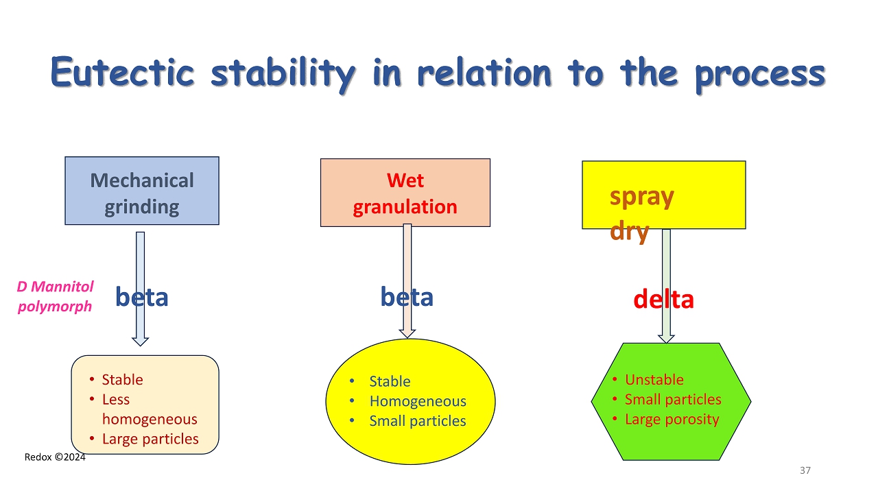 Redox ©2024 Eutectic stability in relation to the process Mechanical grinding Wet granulation spray dry D Mannitol polymorph • Stable • Less homogeneous • Large particles • Stable • Homogeneous • Small particles • Unstable • Small particles • Large porosity beta beta delta 37