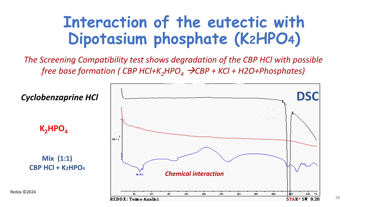 Redox ©2024 Interaction of the eutectic with Dipotasium phosphate (K 2 HPO 4 ) The Screening Compatibility test shows degradation of the CBP HCl with possible free base formation ( CBP HCl+K 2 HPO 4 CBP + KCl + H2O+Phosphates) Cyclobenzaprine HCl K 2 HPO 4 Mix (1:1) CBP HCl + K 2 HPO 4 Chemical interaction 38 DSC