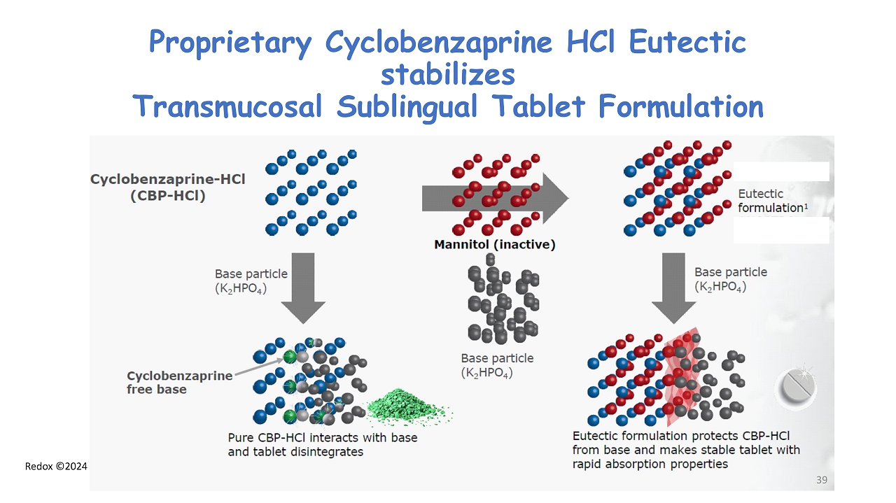 Redox ©2024 Proprietary Cyclobenzaprine HCl Eutectic stabilizes Transmucosal Sublingual Tablet Formulation 39