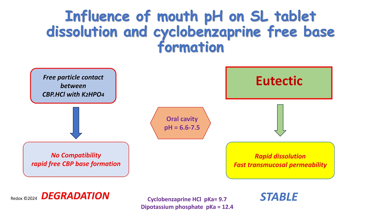 Redox ©2024 Influence of mouth pH on SL tablet dissolution and cyclobenzaprine free base formation No Compatibility rapid free CBP base formation Cyclobenzaprine HCl pKa = 9.7 Dipotassium phosphate pKa = 12.4 Oral cavity pH = 6.6 - 7.5 Eutectic Free particle contact between CBP.HCl with K 2 HPO 4 DEGRADATION Rapid dissolution Fast transmucosal permeability STABLE