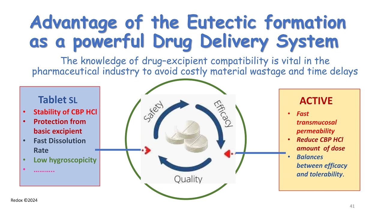 Redox ©2024 Advantage of the Eutectic formation as a powerful Drug Delivery System The knowledge of drug – excipient compatibility is vital in the pharmaceutical industry to avoid costly material wastage and time delays Tablet SL • Stability of CBP HCl • Protection from basic excipient • Fast Dissolution Rate • Low hygroscopicity • ……….. ACTIVE • Fast transmucosal permeability • Reduce CBP HCl amount of dose • Balances between efficacy and tolerability . 41