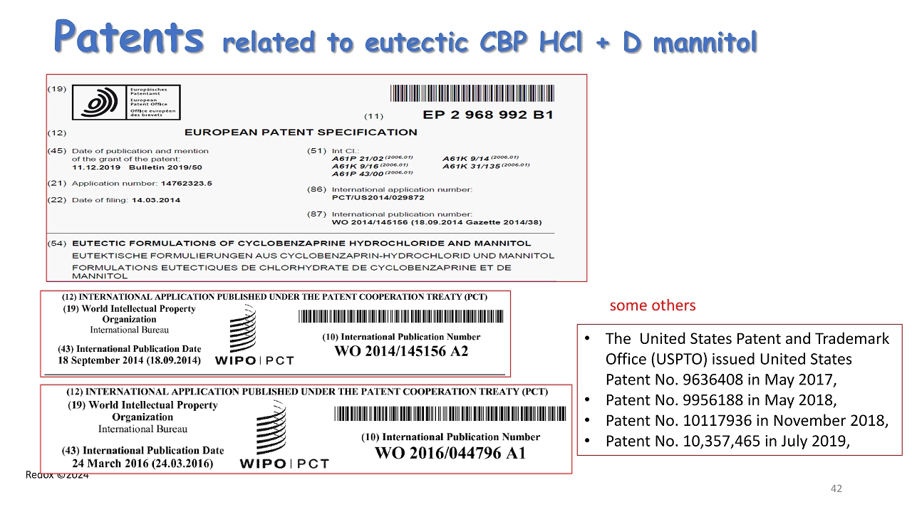 Redox ©2024 Patents related to eutectic CBP HCl + D mannitol 42 • The United States Patent and Trademark Office (USPTO) issued United States Patent No. 9636408 in May 2017, • Patent No. 9956188 in May 2018, • Patent No. 10117936 in November 2018, • Patent No. 10,357,465 in July 2019, some others