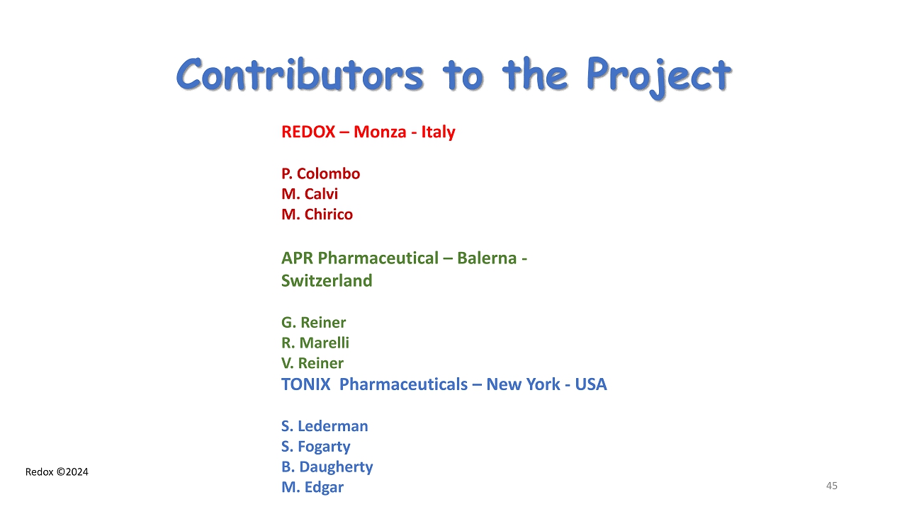 Redox ©2024 Contributors to the Project 45 REDOX – Monza - Italy P. Colombo M. Calvi M. Chirico APR Pharmaceutical – Balerna - Switzerland G. Reiner R. Marelli V. Reiner TONIX Pharmaceuticals – New York - USA S. Lederman S. Fogarty B. Daugherty M. Edgar