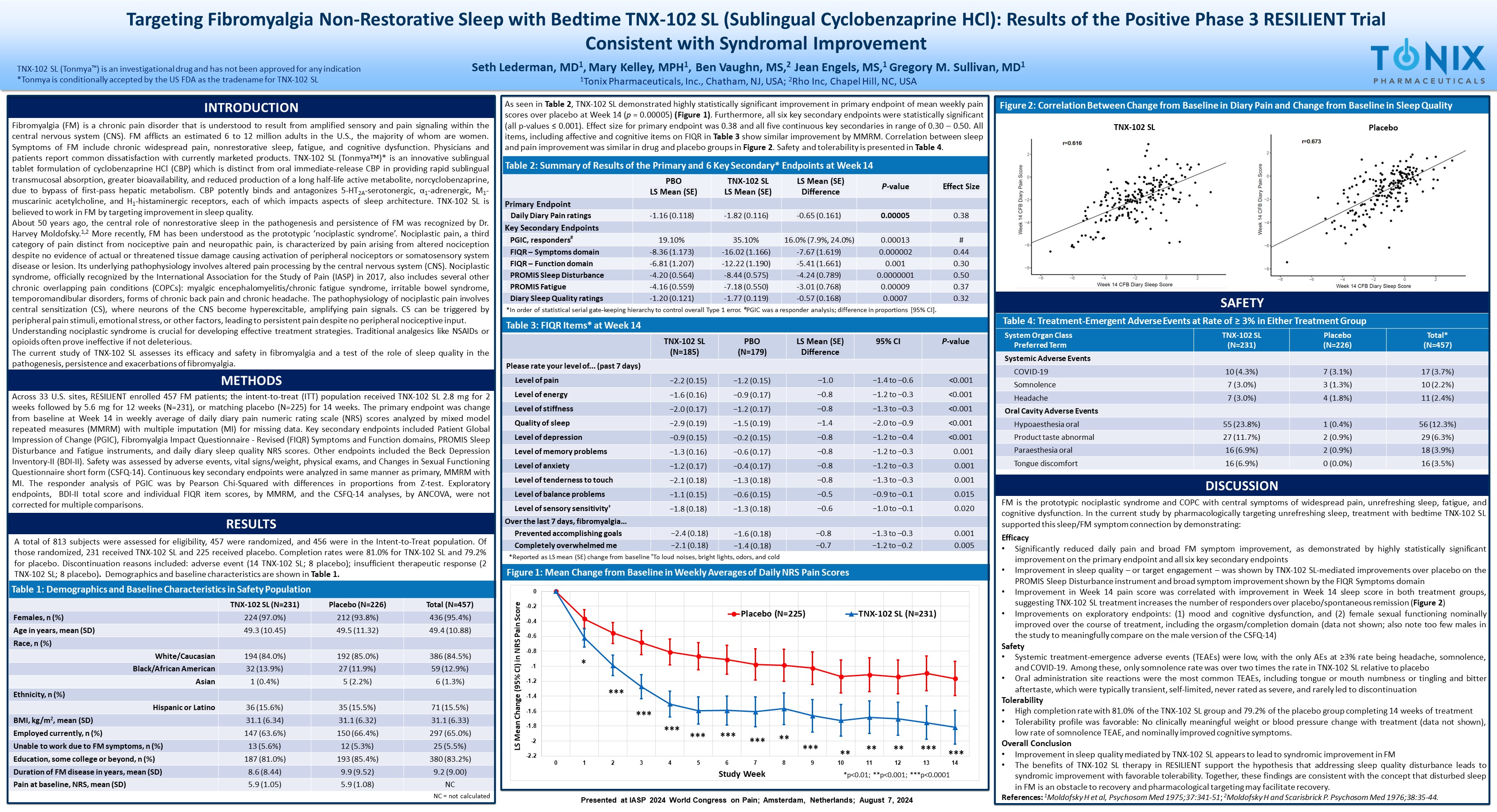 Targeting Fibromyalgia Non - Restorative Sleep with Bedtime TNX - 102 SL (Sublingual Cyclobenzaprine HCl): Results of the Positive P hase 3 RESILIENT Trial Consistent with Syndromal Improvement Seth Lederman, MD 1 , Mary Kelley, MPH 1 , Ben Vaughn, MS, 2 Jean Engels, MS, 1 Gregory M. Sullivan, MD 1 1 Tonix Pharmaceuticals, Inc., Chatham, NJ, USA; 2 Rho Inc, Chapel Hill, NC, USA TNX - 102 SL (Tonmya ) is an investigational drug and has not been approved for any indication *Tonmya is conditionally accepted by the US FDA as the tradename for TNX - 102 SL INTRODUCTION Fibromyalgia (FM) is a chronic pain disorder that is understood to result from amplified sensory and pain signaling within the central nervous system (CNS) . FM afflicts an estimated 6 to 12 million adults in the U . S . , the majority of whom are women . Symptoms of FM include chronic widespread pain, nonrestorative sleep, fatigue, and cognitive dysfunction . Physicians and patients report common dissatisfaction with currently marketed products . TNX - 102 SL ( Tonmya )* is an innovative sublingual tablet formulation of cyclobenzaprine HCl (CBP) which is distinct from oral immediate - release CBP in providing rapid sublingual transmucosal absorption, greater bioavailability, and reduced production of a long half - life active metabolite, norcyclobenzaprine, due to bypass of first - pass hepatic metabolism . CBP potently binds and antagonizes 5 - HT 2 A - serotonergic, α 1 - adrenergic, M 1 - muscarinic acetylcholine, and H 1 - histaminergic receptors, each of which impacts aspects of sleep architecture . TNX - 102 SL is believed to work in FM by targeting improvement in sleep quality . About 50 years ago, t he central role of nonrestorative sleep in the pathogenesis and persistence of FM was recognized by Dr . Harvey Moldofsky . 1 , 2 More recently, FM has been understood as the prototypic ‘ nociplastic syndrome’ . Nociplastic pain, a third category of pain distinct from nociceptive pain and neuropathic pain, is characterized by pain arising from altered nociception despite no evidence of actual or threatened tissue damage causing activation of peripheral nociceptors or somatosensory system disease or lesion . Its underlying pathophysiology involves altered pain processing by the central nervous system (CNS) . Nociplastic syndrome, officially recognized by the International Association for the Study of Pain (IASP) in 2017 , also includes several other chronic overlapping pain conditions (COPCs) : myalgic encephalomyelitis/chronic fatigue syndrome, irritable bowel syndrome, temporomandibular disorders, forms of chronic back pain and chronic headache . The pathophysiology of nociplastic pain involves central sensitization (CS), where neurons of the CNS become hyperexcitable, amplifying pain signals . CS can be triggered by peripheral pain stimuli, emotional stress, or other factors, leading to persistent pain despite no peripheral nociceptive input . Understanding nociplastic syndrome is crucial for developing effective treatment strategies . T raditional analgesics like NSAIDs or opioids often prove ineffective if not deleterious . The current study of TNX - 102 SL assesses its efficacy and safety in fibromyalgia and a test of the role of sleep quality in the pathogenesis, persistence and exacerbations of fibromyalgia . METHODS Across 33 U . S . sites, RESILIENT enrolled 457 FM patients ; the intent - to - treat (ITT) population received TNX - 102 SL 2 . 8 mg for 2 weeks followed by 5 . 6 mg for 12 weeks (N= 231 ), or matching placebo (N= 225 ) for 14 weeks . The primary endpoint was change from baseline at Week 14 in weekly average of daily diary pain numeric rating scale (NRS) scores analyzed by mixed model repeated measures (MMRM) with multiple imputation (MI) for missing data . Key secondary endpoints included Patient Global Impression of Change (PGIC), Fibromyalgia Impact Questionnaire - Revised (FIQR) Symptoms and Function domains, PROMIS Sleep Disturbance and Fatigue instruments, and daily diary sleep quality NRS scores . Other endpoints included the Beck Depression Inventory - II (BDI - II) . Safety was assessed by adverse events, vital signs/weight, physical exams, and Changes in Sexual Functioning Questionnaire short form (CSFQ - 14 ) . Continuous key secondary endpoints were analyzed in same manner as primary, MMRM with MI . The responder analysis of PGIC was by Pearson Chi - Squared with differences in proportions from Z - test . Exploratory endpoints, BDI - II total score and individual FIQR item scores, by MMRM, and the CSFQ - 14 analyses, by ANCOVA, were not corrected for multiple comparisons . RESULTS As seen in Table 2 , TNX - 102 SL demonstrated highly statistically significant improvement in primary endpoint of mean weekly pain scores over placebo at Week 14 ( p = 0 . 00005 ) (Figure 1 ) . Furthermore, all six key secondary endpoints were statistically significant (all p - values ≤ 0 . 001 ) . Effect size for primary endpoint was 0 . 38 and all five continuous key secondaries in range of 0 . 30 – 0 . 50 . All items, including affective and cognitive items on FIQR in Table 3 show similar improvement by MMRM . Correlation between sleep and pain improvement was similar in drug and placebo groups in Figure 2 . Safety and tolerability is presented in Table 4 . Figure 1: Mean Change from Baseline in Weekly Averages of Daily NRS Pain Scores Table 4: Treatment - Emergent Adverse Events at Rate of ≥ 3% in Either Treatment Group Total* (N=457) Placebo (N=226) TNX - 102 SL (N=231) System Organ Class Preferred Term Systemic Adverse Events 17 (3.7%) 7 (3.1%) 10 (4.3%) COVID - 19 10 (2.2%) 3 (1.3%) 7 (3.0%) Somnolence 11 (2.4%) 4 (1.8%) 7 (3.0%) Headache Oral Cavity Adverse Events 56 (12.3%) 1 (0.4%) 55 (23.8%) Hypoaesthesia oral 29 (6.3%) 2 (0.9%) 27 (11.7%) Product taste abnormal 18 (3.9%) 2 (0.9%) 16 (6.9%) Paraesthesia oral 16 (3.5%) 0 (0.0%) 16 (6.9%) Tongue discomfort SAFETY FM is the prototypic nociplasti