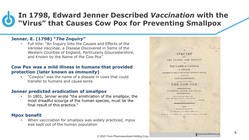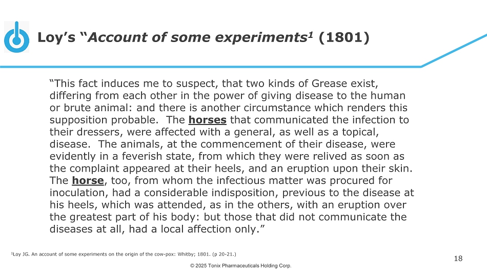 © 2025 Tonix Pharmaceuticals Holding Corp. First Live Virus Vaccine: Edward Jenner’s Inquiry 1 (1798) – 2/2 1 Jenner, E. “An Inquiry Into the Causes and Effects of the Variolae Vaccinae , a Disease Discovered in Some of the Western Counties of England, Particularly Gloucestershire, and Known by the Name of the Cow Pox (p 3.) “In this Dairy Country a great number of Cows are kept, and the office of milking is performed indiscriminately by Men and Maid Servants. One of the former having been appointed to apply dressings to the heels of a Horse affected with the Grease , and not paying due attention to cleanliness, incautiously bears his part in milking the Cows, with some particles of the infectious matter adhering to his fingers. When this is the case, it commonly happens that a disease is communicated to the Cows, and from the Cows to the Dairy - maids, which spreads through the farm until most of the cattle and domestics feel its unpleasant consequences. The disease has obtained the name of the Cow Pox .” 17