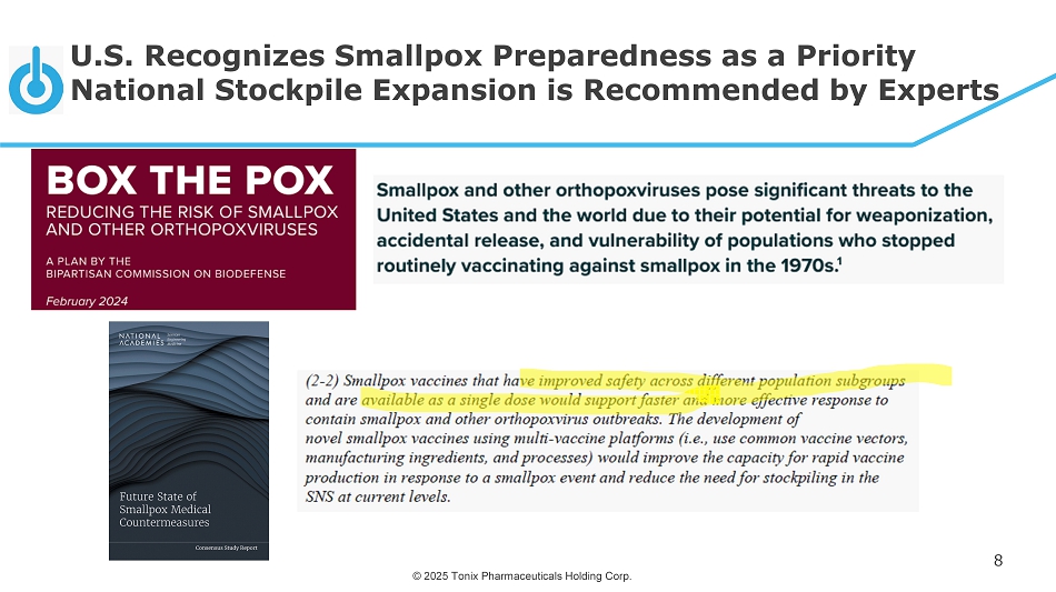 © 2025 Tonix Pharmaceuticals Holding Corp. U.S. Recognizes Smallpox Preparedness as a Priority National Stockpile Expansion is Recommended by Experts 8