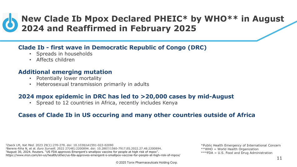 © 2025 Tonix Pharmaceuticals Holding Corp. Mpox Outbreak 2022 - 23: Clade IIb: WHO Public Health Emergency Global Health Concern (PHEIC) 10 Risk of Spread and Lethality of Clade IIb • Case Fatality Rate (CFR): 0.1% to 3.6% Lower compared to Clade I • Primarily spread through sexual contact among gay men outside Africa • Rapid and significant spread beyond endemic regions Over 90,000 cases reported in more than 100 countries by the end of 2022 • Systemic symptoms and rash leading to medical interventions in up to 40% of cases Sources: WHO, European CDC, US CDC, and Ministries of Health 2022 U.S. Map and Case Count | Mpox | Poxvirus | CDC WHO = World Health Organization FDA = U.S. Food and Drug Administration Total Cases: 95,912; 92,982 were in locations that have not historically reported Mpox Total Location: 118; 111 has not historically reported Mpox