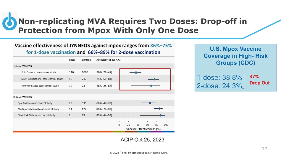 © 2025 Tonix Pharmaceuticals Holding Corp. New Clade Ib Mpox Declared PHEIC* by WHO** in August 2024 and Reaffirmed in February 2025 Clade Ib - first wave in Democratic Republic of Congo (DRC) • Spreads in households • Affects children Additional emerging mutation • Potentially lower mortality • H eterosexual transmission primarily in adults 2024 mpox epidemic in DRC has led to >20,000 cases by mid - August • Spread to 12 countries in Africa, recently includes Kenya Cases of Clade Ib in US occuring and many other countries outside of Africa 1 Zaeck LM, Nat Med. 2023 29(1):270 - 278. doi : 10.1038/s41591 - 022 - 02090 2 Berens - Riha N, et al. Euro Surveill . 2022 27(48):2200894. doi : 10.2807/1560 - 7917.ES.2022.27.48.2200894. 3 August 30, 2024. Reuters. “US FDA approves Emergent's smallpox vaccine for people at high risk of mpox”. https://www.msn.com/en - us/health/other/us - fda - approves - emergent - s - smallpox - vaccine - for - people - at - high - risk - of - mpox/ 11 *Public Health Emergency of International Concern **WHO = World Health Organization ***FDA = U.S. Food and Drug Administration