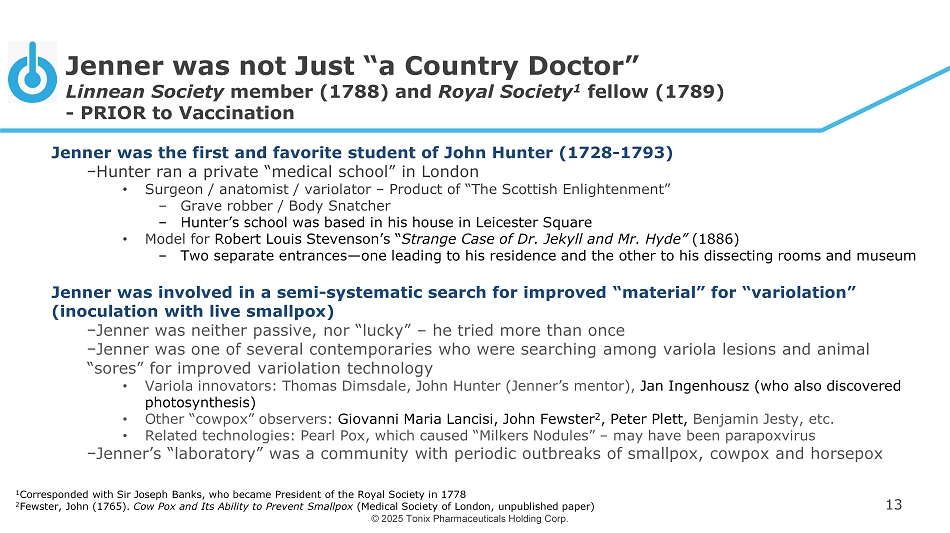 © 2025 Tonix Pharmaceuticals Holding Corp. Jenner was not Just “a Country Doctor” Linnean Society member (1788) and Royal Society 1 fellow (1789) - PRIOR to Vaccination Jenner was the first and favorite student of John Hunter (1728 - 1793) − Hunter ran a private “medical school” in London • Surgeon / anatomist / variolator – Product of “The Scottish Enlightenment” ‒ Grave robber / Body Snatcher ‒ Hunter’s school was based in his house in Leicester Square • Model for Robert Louis Stevenson’s “ Strange Case of Dr. Jekyll and Mr. Hyde” (1886) ‒ Two separate entrances — one leading to his residence and the other to his dissecting rooms and museum Jenner was involved in a semi - systematic search for improved “material” for “variolation” (inoculation with live smallpox) − Jenner was neither passive, nor “lucky” – he tried more than once − Jenner was one of several contemporaries who were searching among variola lesions and animal “sores” for improved variolation technology • Variola innovators: Thomas Dimsdale, John Hunter (Jenner’s mentor), Jan Ingenhousz (who also discovered photosynthesis) • Other “cowpox” observers: Giovanni Maria Lancisi , John Fewster 2 , Peter Plett, Benjamin Jesty , etc. • Related technologies: Pearl Pox, which caused “Milkers Nodules” – may have been parapoxvirus − Jenner’s “laboratory” was a community with periodic outbreaks of smallpox, cowpox and horsepox 13 1 Corresponded with Sir Joseph Banks, who became President of the Royal Society in 1778 2 Fewster, John (1765). Cow Pox and Its Ability to Prevent Smallpox (Medical Society of London, unpublished paper)