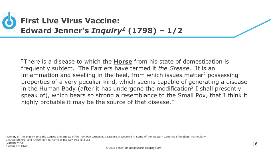© 2025 Tonix Pharmaceuticals Holding Corp. Jenner "vaccinated” healthy individuals with “vaccine” • F rom vacca , Latin for “cow” The material from “cow pox” sores conferred protection against smallpox virus • Originally came from a milkmaid’s hands; Jenner suspected that the virus originated in horses • He observed that the virus had been transferred from horses to cows’ udders by the hands of farriers Edward Jenner Successfully Used Vaccination to Protect Against Smallpox : Virus came from Horses 15 The College of Physicians of Philadelphia. Accessed July 15, 2021. https:/ /w w w.historyofvaccines.org