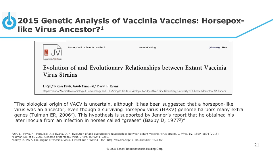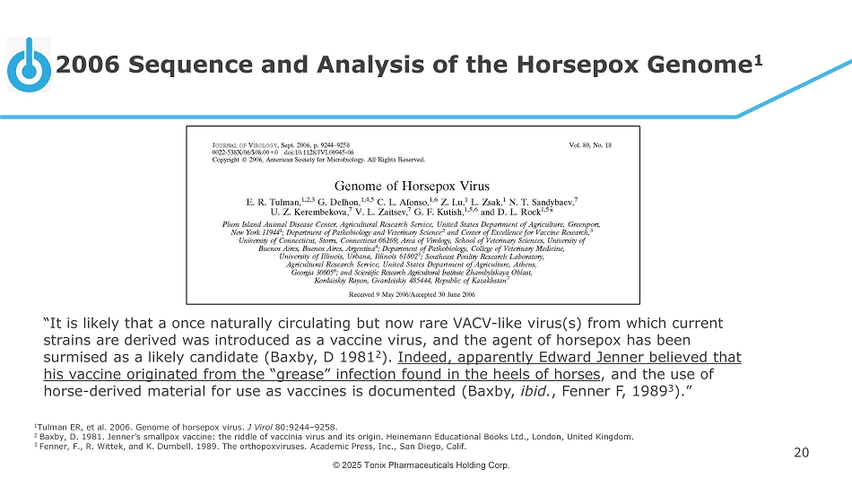 © 2025 Tonix Pharmaceuticals Holding Corp. 2006 Sequence and Analysis of the Horsepox Genome 1 20 “ It is likely that a once naturally circulating but now rare VACV - like virus(s) from which current strains are derived was introduced as a vaccine virus, and the agent of horsepox has been surmised as a likely candidate ( Baxby , D 1981 2 ). Indeed, apparently Edward Jenner believed that his vaccine originated from the “grease” infection found in the heels of horses , and the use of horse - derived material for use as vaccines is documented ( Baxby , ibid. , Fenner F, 1989 3 ). ” 1 Tulman ER, et al. 2006. Genome of horsepox virus. J Virol 80:9244 – 9258 . 2 Baxby , D. 1981. Jenner’s smallpox vaccine: the riddle of vaccinia virus and its origin. Heinemann Educational Books Ltd., London, Uni ted Kingdom. 3 Fenner , F., R. Wittek , and K. Dumbell . 1989. The orthopoxviruses . Academic Press, Inc., San Diego, Calif.